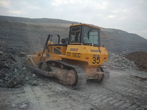 山推DH17推土机在印度某大型露天国有煤矿施工,该矿多岩石及土夹石工况,主要用于露天采煤工作平台回填,以及爆破后采煤作业平台碎石平整清理和短距离推运等工作。工作强度大,三班倒每天工作15小时以上,环境温度高,工地温度高达50℃,持续约3个月。