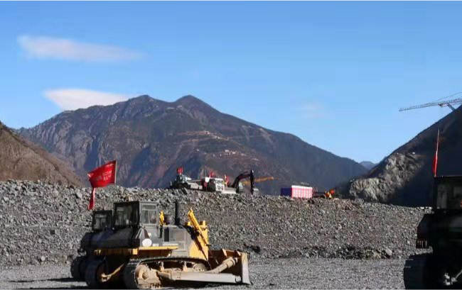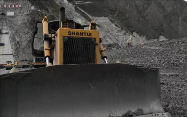 SD32推土机进行西南地区水电站坝体建设,推土机将土、石子等松散物料进行推移堆积,压路机压平,浇注混凝土形成坝体。