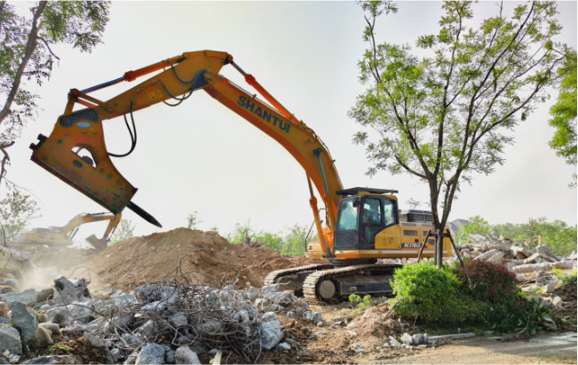 山东某地违章建筑群拆除施工,施工工期短、进度急,二十四小时连续作业,山推数台挖掘机参与施工。多种品牌挖掘机同台作业,山推挖掘机机以动力足、质量好、效率高、故障率低得到施工方认可。