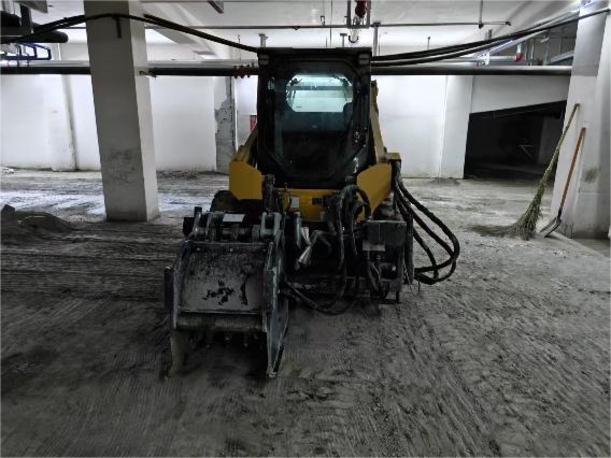 该小区地处市区核心板块,周边配套完善,地库总面积约3万平方米,整体为水泥硬化地面。为满足后续自流平地坪施工的需求,地面必须经过铣刨处理,确保材料与基础面充分贴合。此前,客户主要采用人工手推式铣刨鼓进行处理,效率低、粉尘大、劳动强度高,难以满足项目对施工进度和质量的一致性要求。