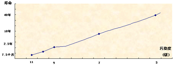 世界各研究机构在进行研究污染度对寿命的影响时,所给出的研究结果差异很大,这主要是因为工作环境、污染物成分及颗粒硬度等因素不同的结果。一般来说(以NAS1638标准),污染度降低一级,寿命延长一倍,反之亦然。假定使用污染度为7级(NAS1638)的油液,机器的寿命为10年,同样是这样一台机器将油液的污染度降低几级,寿命就有惊人的变化。